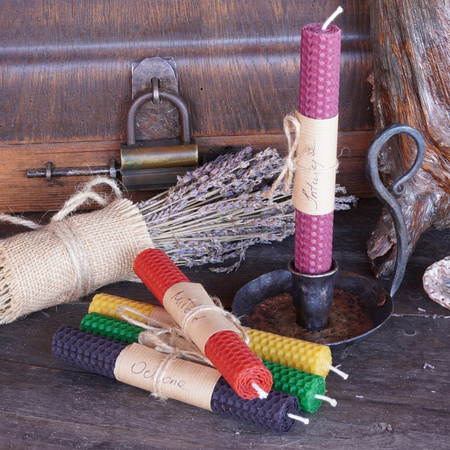 Fioletowa świeca rytualna z naturalnego wosku pszczelego, z dodatkiem starannie dobranych ziół zbieranych ręcznie na plantacji Silna Lawenda. Wspiera rozwój intuicji, pogłębianie świadomości oraz kontakt z wewnętrzną mądrością.