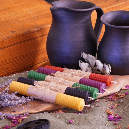 Wosk pszczeli, od wieków uznawany za materiał czysty i żywy, podczas palenia wydziela subtelny, ciepły aromat, sprzyjający wyciszeniu i skupieniu. Zioła dobierane są intuicyjnie i z uważnością, tak aby harmonizowały z przeznaczeniem każdej świecy oraz wspierały pracę intencyjną.