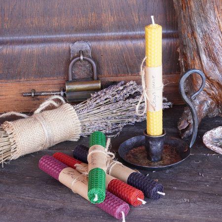 Żółta świeca rytualna z wosku pszczelego, wzbogacona ziołami zbieranymi ręcznie na plantacji Silna Lawenda. Stworzona do pracy z energią oczyszczenia, odpuszczania i wewnętrznej jasności.